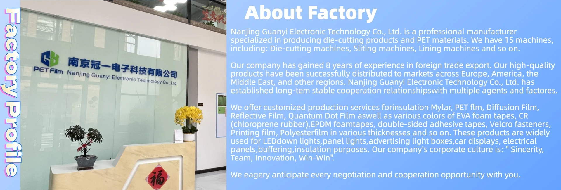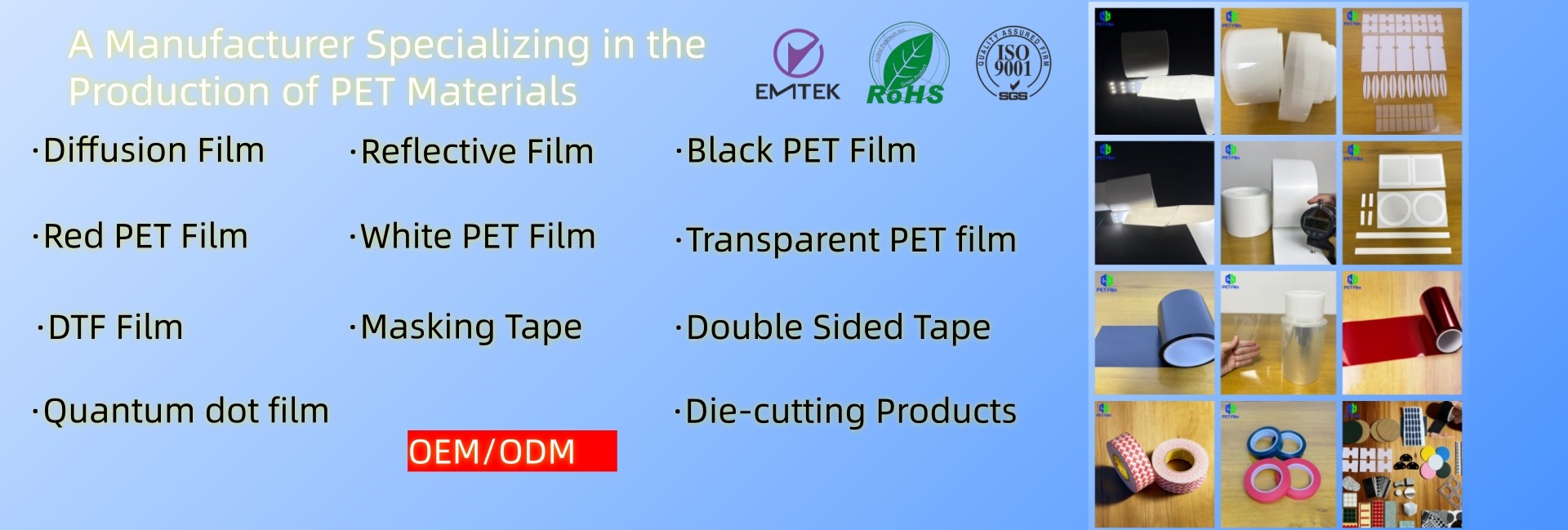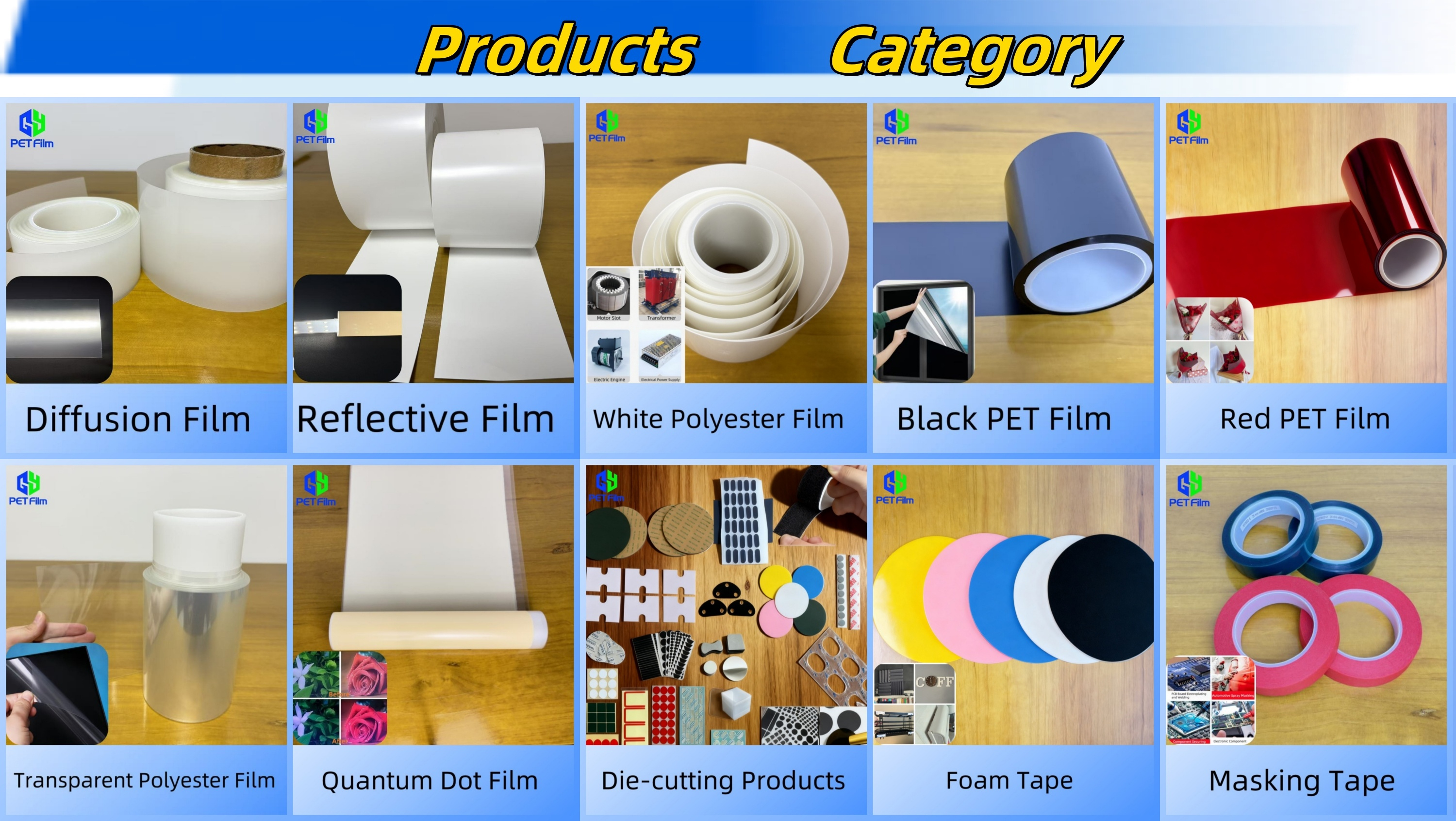 Prodotti principali: Pellicola di diffusione, pellicola riflettente, nastro di schiuma, Film Quantum Dot, pellicola in poliestere